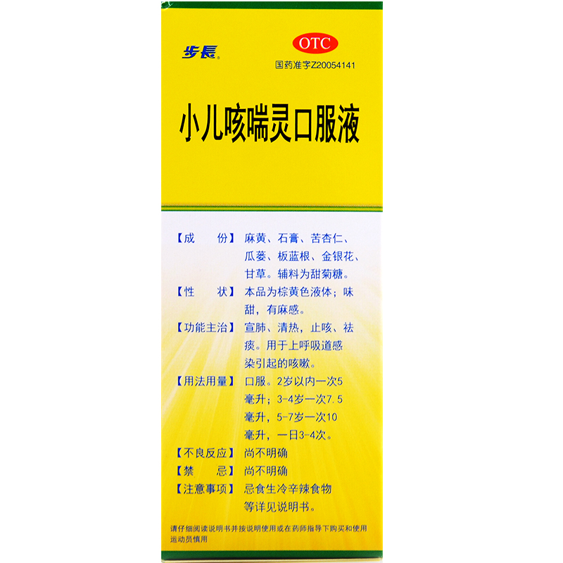【注意事項】 1、忌辛辣、生冷、油膩食物?! ?2、不宜在服藥期間同時服用滋補性中藥?! ?3、嬰兒及糖尿病患兒應(yīng)在醫(yī)師指導(dǎo)下服用。 4、高血壓、心臟病患兒慎用。脾虛易腹瀉者應(yīng)在醫(yī)師指導(dǎo)下服用?! ?5、該藥品是以清宣肺熱,止咳平喘為主,可以在小兒發(fā)熱初起,咳嗽不重的情況下服用,若見高熱痰多,氣促鼻煽者應(yīng)及時去醫(yī)院就診?! ?6、咳嗽久治不愈,或頻咳伴吐,應(yīng)去醫(yī)院就診?! ?7、發(fā)熱體溫超過38.5℃的患者,應(yīng)去醫(yī)院就診。 8、服藥3天癥狀無緩解,應(yīng)去醫(yī)院就診?! ?9、對該藥品過敏者禁用,過敏體質(zhì)者慎用?! ?10、該藥品性狀發(fā)生改變時禁止使用?! ?11、兒童必須在成人監(jiān)護下使用?! ?12、請將該藥品放在兒童不能接觸的地方?! ?13、如正在使用其他藥品,使用該藥品前請咨詢醫(yī)師或藥師。