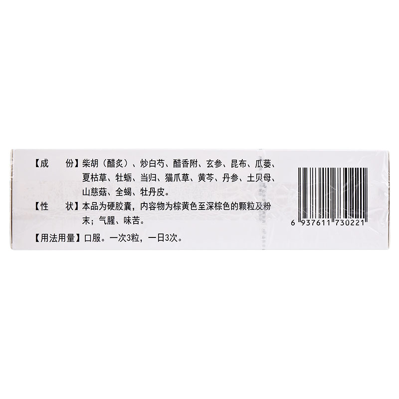 【主要成份】柴胡(醋炙)、炒白芍、醋香附、玄參、昆布、瓜蔞、夏枯草、牡蠣、當(dāng)歸、貓爪草、黃芩、丹參、土貝母、山慈菇、全蝎、牡丹皮。